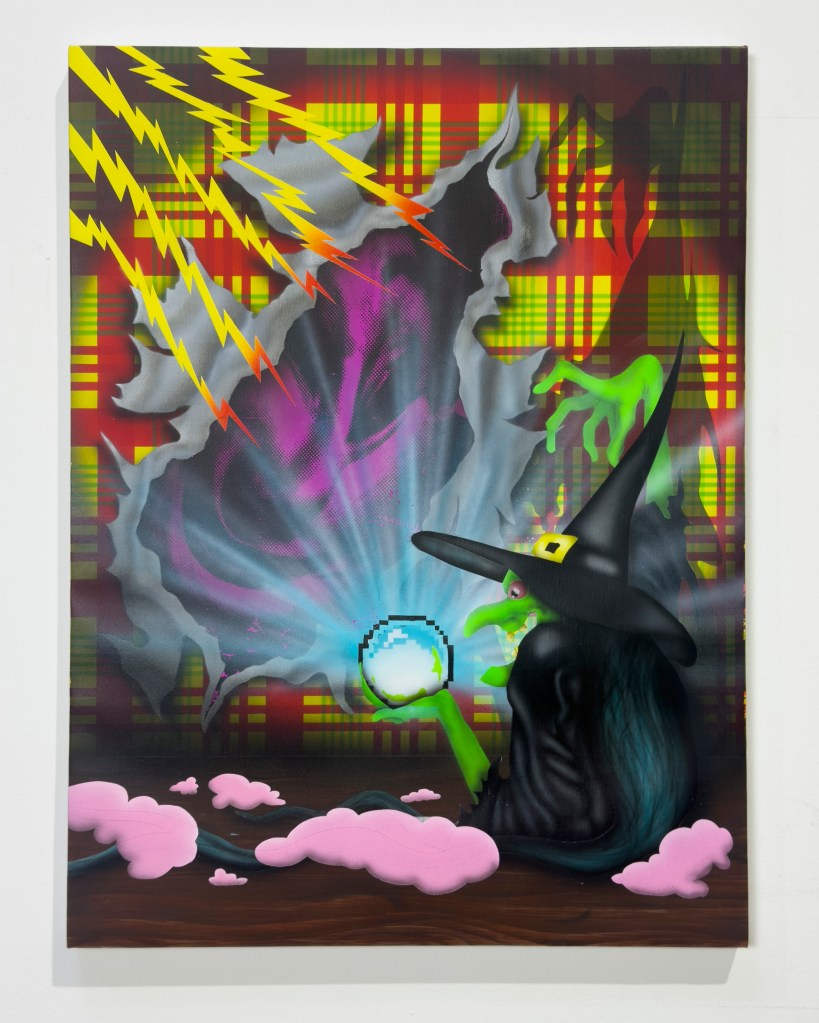 Problem In Chair Not In Computer, 2025, Acrylic, Flashe, and Silkscreen on Canvas, 36 in by 48 in